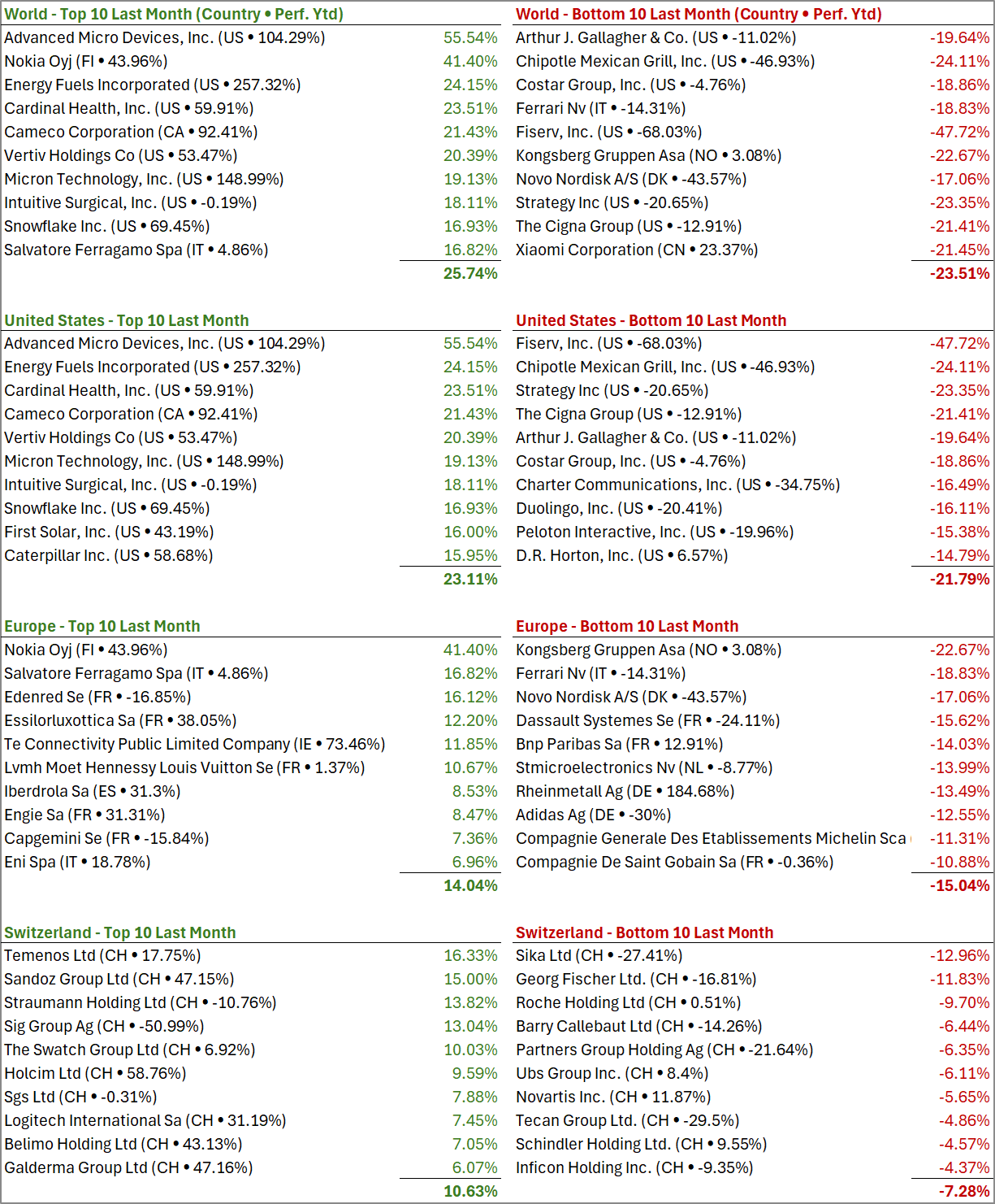 Focus titres. Nokia Oyj (+41.4% Mtd) a touché un plus haut pour la décennie 2015-2025, aidé par l’optique et l’IA, et par l’annonce d’un investissement autour de Usd 1B, soit environ 2.9%, par Nvidia. AMD (+55.5% Mtd) profite d’un accord d’approvisionnement très médiatisé et du cycle capex IA. Ferrari corrige (-18.8%) après des objectifs long terme jugés tièdes. Novo Nordisk subit la pression des discussions sur les prix U.S. et de sujets de gouvernance. Xiaomi (-21.4% Mtd) pâtit de prises de profits et d’un positionnement sensible. Chez BR & H Finance, nous restons fans de Xiaomi (+23.3% en Ytd), que nous voyons comme un mix d’Apple et de Tesla.