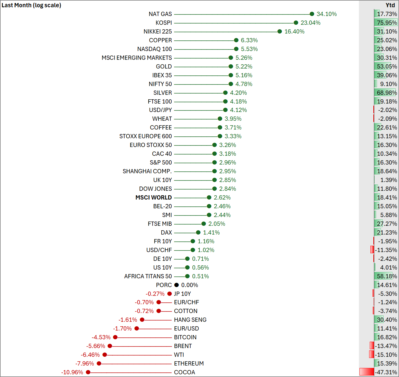 Tour d’horizon rapide. Le Nikkei225 (+16.4% Mtd) signe un record historique, aidé par un yen faible et la tech, avec la plus forte hausse mensuelle depuis 1994. Le KOSPI inscrit un plus-haut historique (+23%), porté par les semi-conducteurs et la défense. L’Eurostoxx50 suit la poussée paneuropéenne, soutenue par les banques et le luxe, et l’IBEX35 dépasse enfin son pic de 2007 sur un rallye bancaire. Le cuivre s’installe sur un plus-haut historique autour de Usd 11'200 la tonne. Côté crypto, Bitcoin consolide après des sorties sur certains ETFs ; le fonds américain de BlackRock reste l’ancre des encours et le BTC a oscillé près de Usd 110'000 en fin de semaine dernière, tandis qu’Ethereum se traite autour de Usd 3'700–3'900, sous son précédent ATH d’environ Usd 4'950.