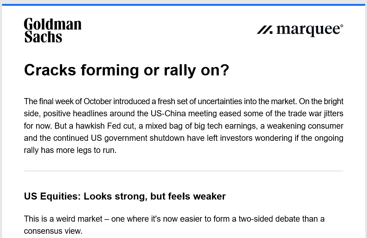 Dernière minute : au cours des 48 dernières heures, le marché a souffert, tandis que le rapport ci-après ne prend en compte que la situation à fin octobre. Goldman Sachs résume bien la situation :